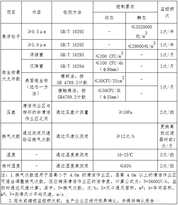 第十一条 在工艺设备安装完毕或重大改造后应对清洁作业区的空气洁净度进行监测,符合要求后方可投入生产。清洁作业区空气洁净度要求和监测频次按表3进行。