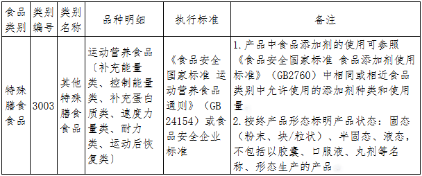 表1 运动营养食品生产许可类别目录列表