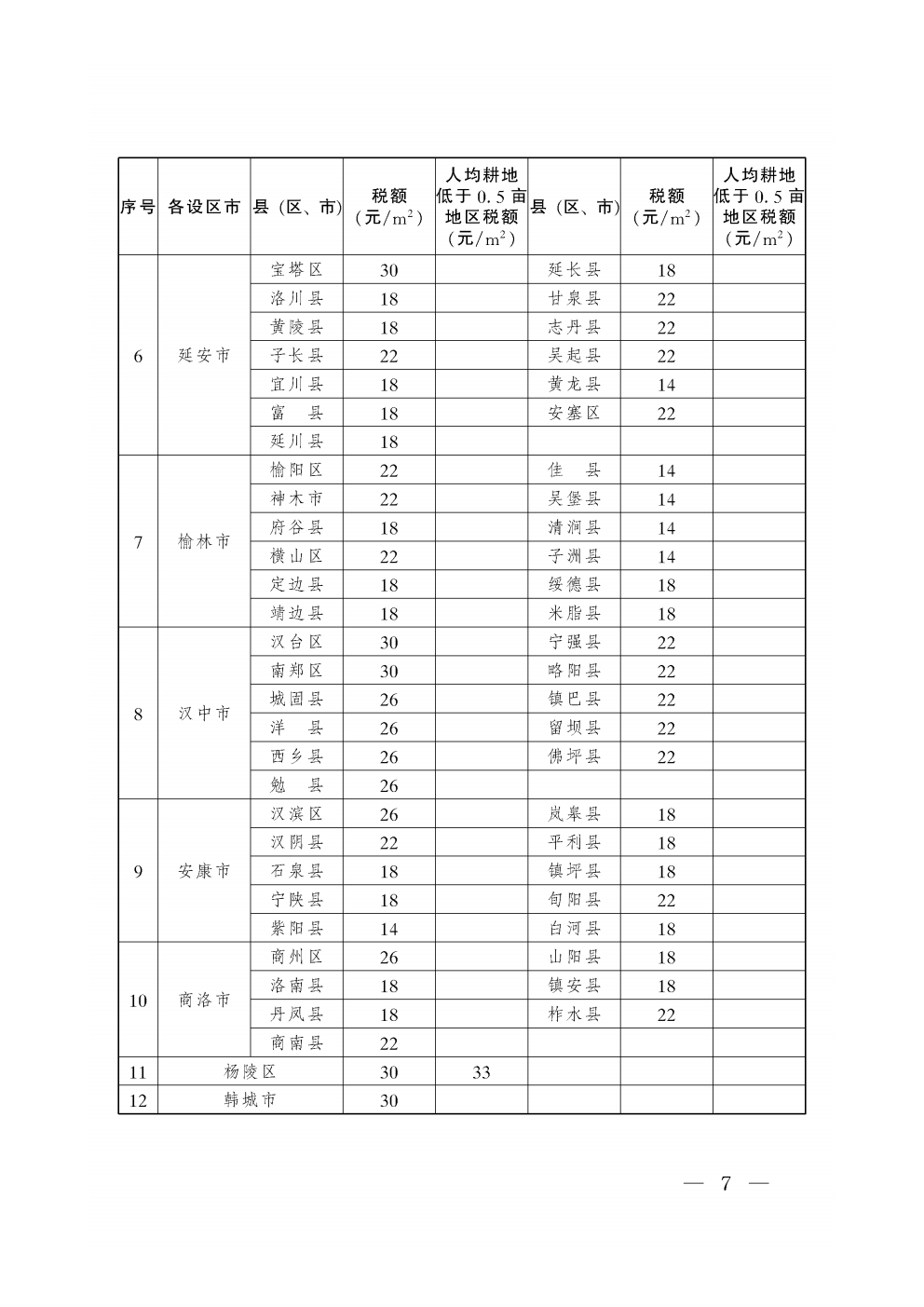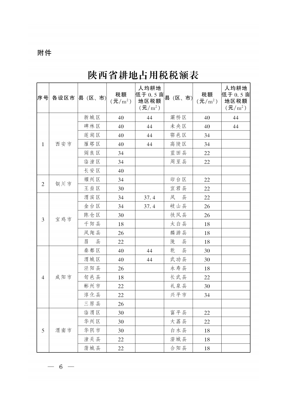 第四条 县级行政区域耕地占用税的适用税额,根据人均耕地面积和经济发展情况核定。具体税额见《陕西省耕地占用税税额表》。