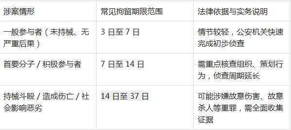 涉案情节轻重:持械斗殴、造成多人轻伤以上后果等加重情节,会触发 37 日最长拘留期限。